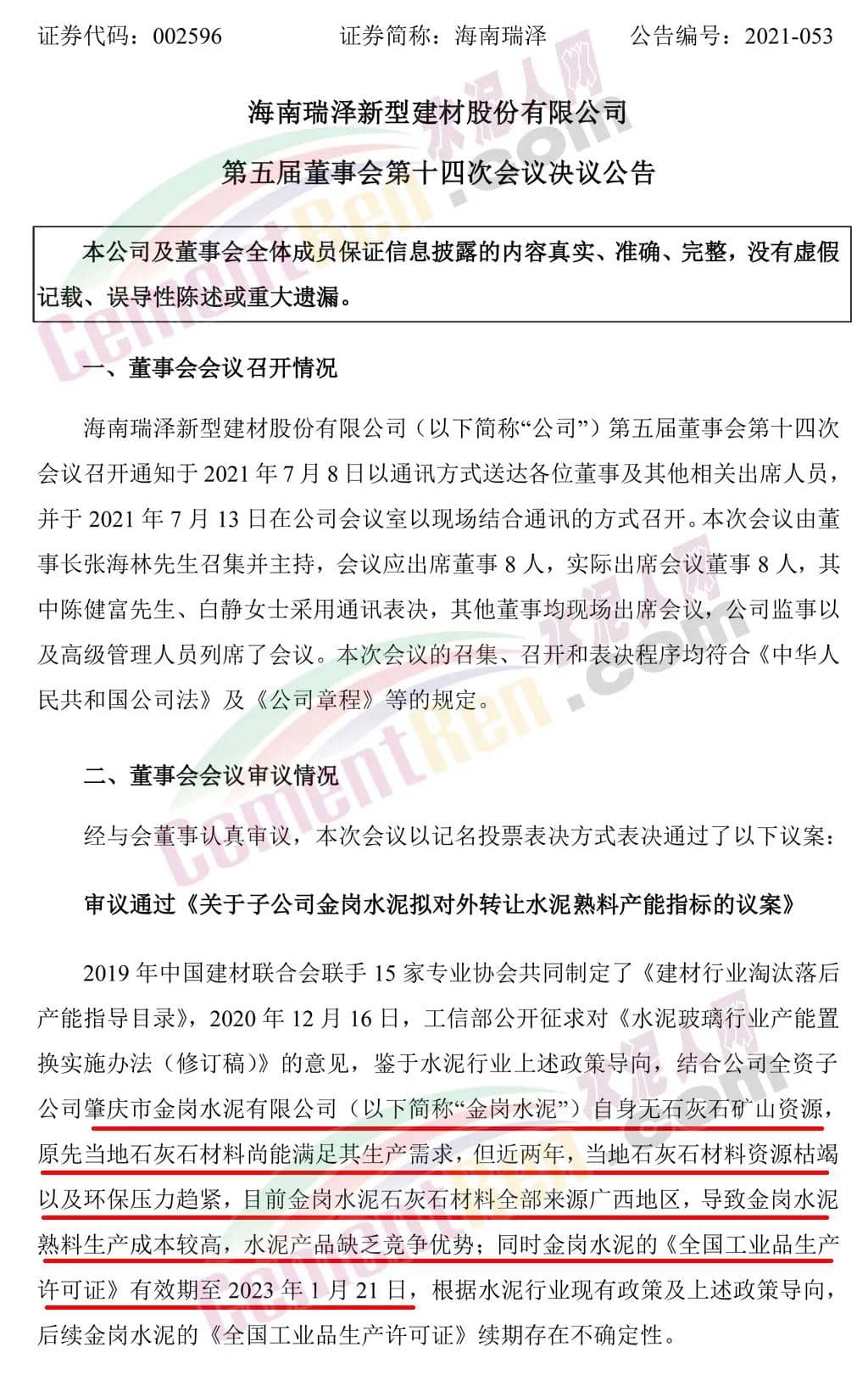 海南瑞澤新型建材股份有限公司上市公司發布第五屆董事會第十四次會議決議公告提到,鑒于水泥行業政策導向,結合公司全資子公司肇慶市金崗水泥有限公司(以下簡稱“金崗水泥”)自身無石灰石礦山資源,原先當地石灰石材料尚能滿足其生產需求,但近兩年,當地石灰石材料資源枯竭以及環保壓力趨緊,目前金崗水泥石灰石材料全部來源廣西地區,導致金崗水泥熟料生產成本較高,水泥產品缺乏競爭優勢;