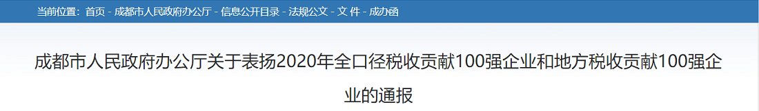 為表揚先進、鼓舞干勁,幫助優秀企業增譽增信,經市委、市政府同意,現對四川中煙工業有限責任公司等2020年全口徑稅收貢獻100強企業和地方稅收貢獻100強企業予以通報表揚。希望受到表揚的企業珍惜榮譽,持續提升質量效益,為城市發展再立新功。希望全市企業主動對標先進,積極融入新發展格局,把握城市發展戰略,加快科技創新和轉型升級,投身幸福美好生活十大工程建設,為全市經濟高質量發展多作貢獻。