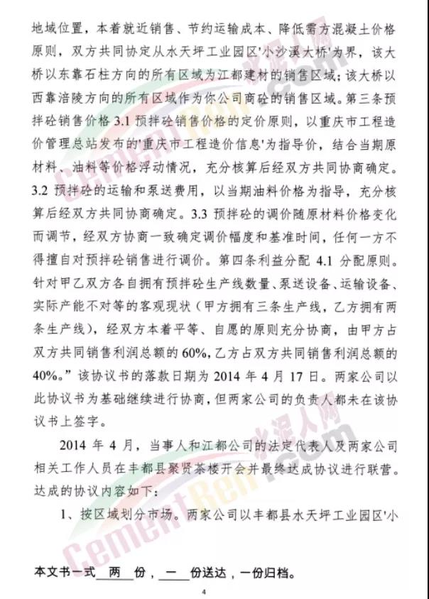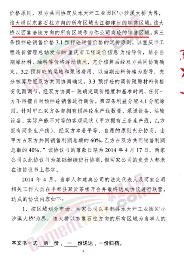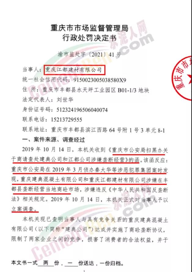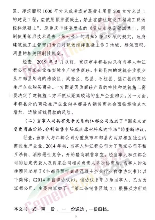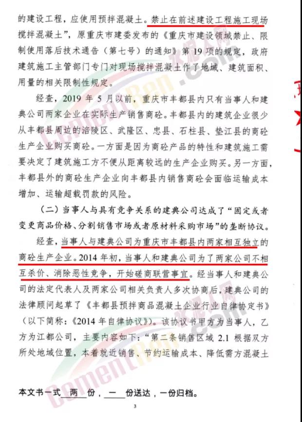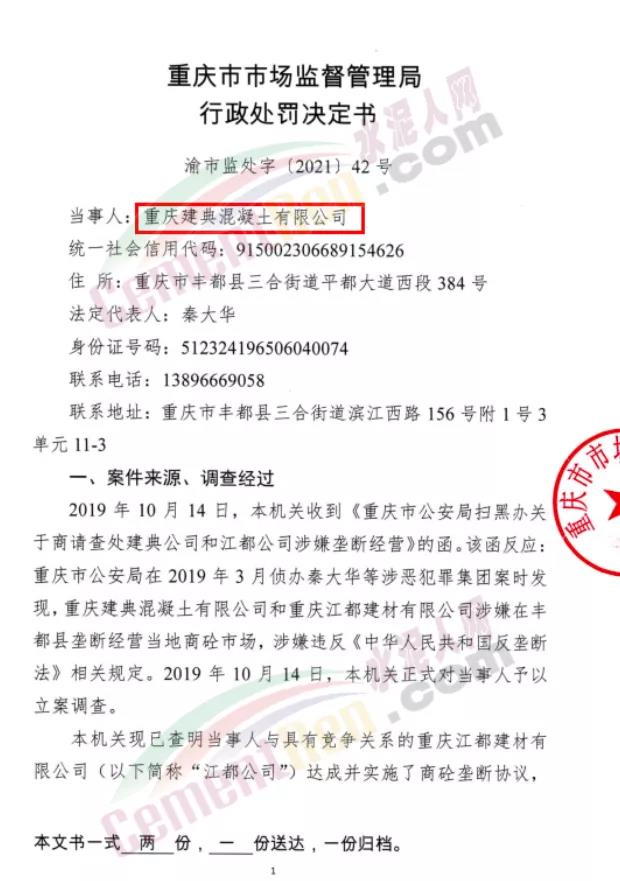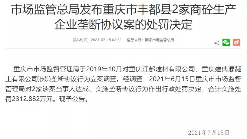 7月15日市場監管總局發布重慶市豐都縣2家商砼生產企業壟斷協議案的處罰決定稱,重慶市市場監督管理局于2019年10月對重慶江都建材有限公司、重慶建典混凝土有限公司涉嫌壟斷協議行為立案調查。經調查,2021年6月15日重慶市市場監督管理局對2家涉案當事人達成、實施壟斷協議行為作出行政處罰決定,合計實施處罰2312.882萬元。