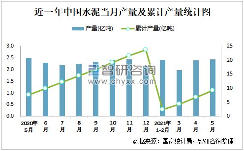 根據國家統計局數據顯示:2021年5月中國水泥產量為2.4億噸,同比下降3.2%;2021年1-5月中國水泥累計產量為9.2億噸,累計增長19.2%;2015-2020年中國水泥產量2018年跌至最低,此后呈現上升趨勢。
