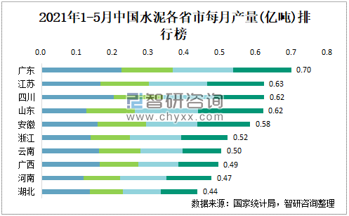 根據國家統計局數據顯示:2021年各季度(第二季度目前暫只統計4月和5月數據)中國水泥主要集中在華東、西南、華中地區生產;2021年1-5月中國水泥產量大區分布不均衡,其中華東地區產量最高,特別是江蘇、山東、安徽貢獻的產量占比較多;2021年1-5月中國水泥各省市產量呈現梯隊式分布,廣東、江蘇、四川等省產量最多。