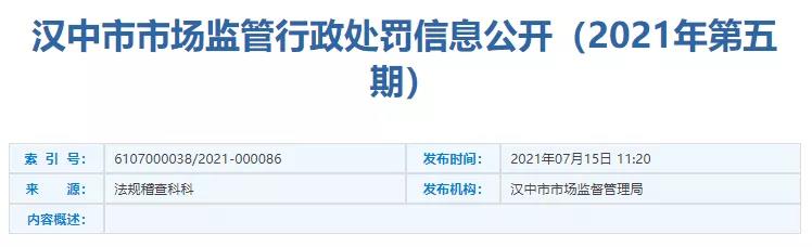 做出處罰的機關名稱和日期:漢中市市場監督管理局2021年6月22日