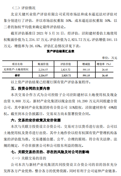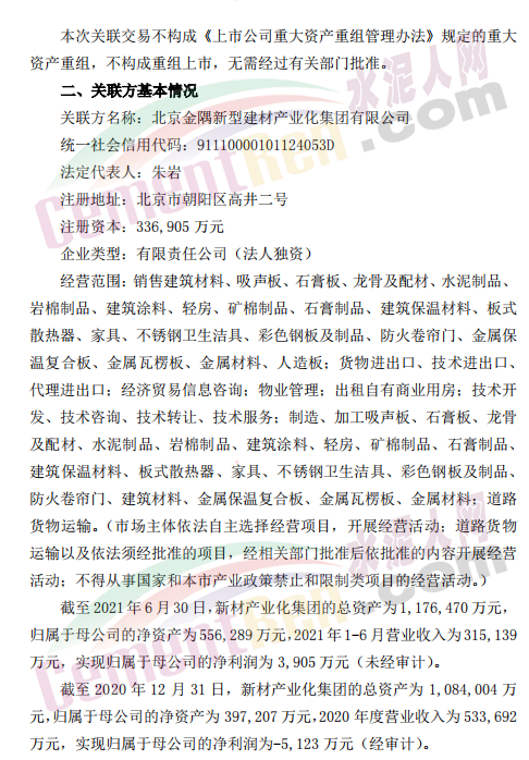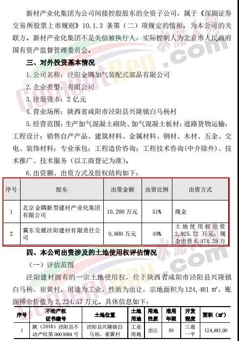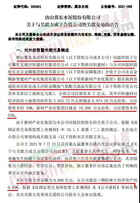 冀東水泥7月19日晚間發(fā)布公告稱,唐山冀東水泥股份有限公司間接控股子公司冀東發(fā)展涇陽建材有限責(zé)任公司與公司間接控股股東北京金隅集團(tuán)股份有限公司全資子公司北京金隅新型建材產(chǎn)業(yè)化集團(tuán)有限公司擬在陜西省咸陽市涇陽縣成立涇陽金隅加氣裝配式部品有限公司,合資公司注冊資本2億元,其中涇陽建材以經(jīng)評估的土地使用權(quán)作價(jià)2,825.72萬元和現(xiàn)金6,974.28萬元出資,占注冊資本的49%;新材產(chǎn)業(yè)化集團(tuán)以現(xiàn)金10,200萬元出資,占注冊資本的51%。