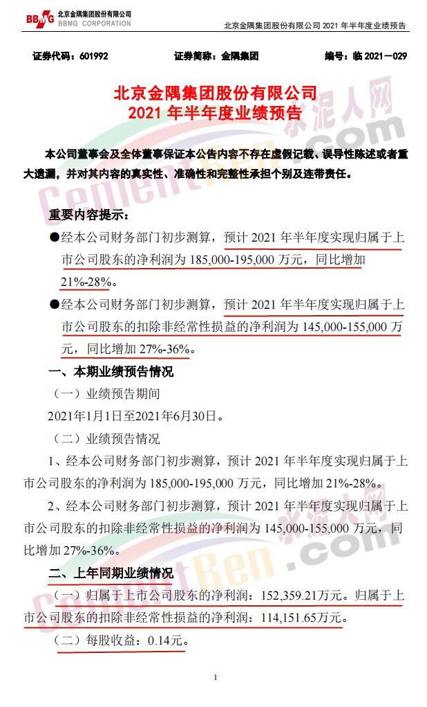 與此同時,金隅集團預計2021年上半年實現歸屬于上市公司股東的扣除非經常性損益的凈利潤為14.5億元-15.5億元,同比增長27%-36%。
