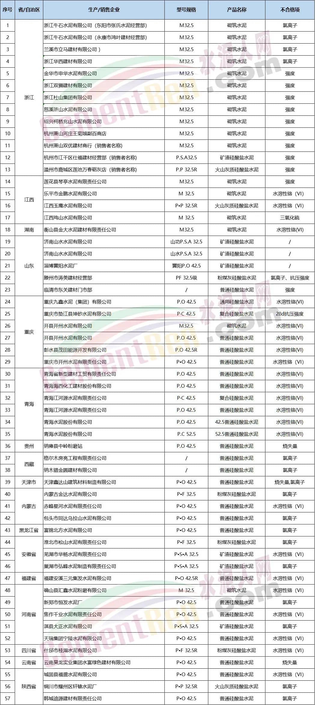 然而,當(dāng)前市場(chǎng)上的水泥質(zhì)量并不樂觀。據(jù)水泥人網(wǎng)不完全統(tǒng)計(jì),僅2021年以來,各地市場(chǎng)監(jiān)管局通報(bào)的水泥質(zhì)量不合格企業(yè)就多達(dá)57家,通報(bào)的不合格水泥不僅包括32.5等級(jí)標(biāo)號(hào)水泥也包括42.5等級(jí)的普通硅酸鹽水泥,不合格項(xiàng)目更是涉及到了抗壓、抗折強(qiáng)度、三氧化硫、氯離子、燒失量、水溶性鉻(Ⅵ)等多個(gè)方面。2021年1月1日至今被各省市自治區(qū)市場(chǎng)監(jiān)管部門通報(bào)不合格水泥生產(chǎn)/銷售企業(yè)名單如下: