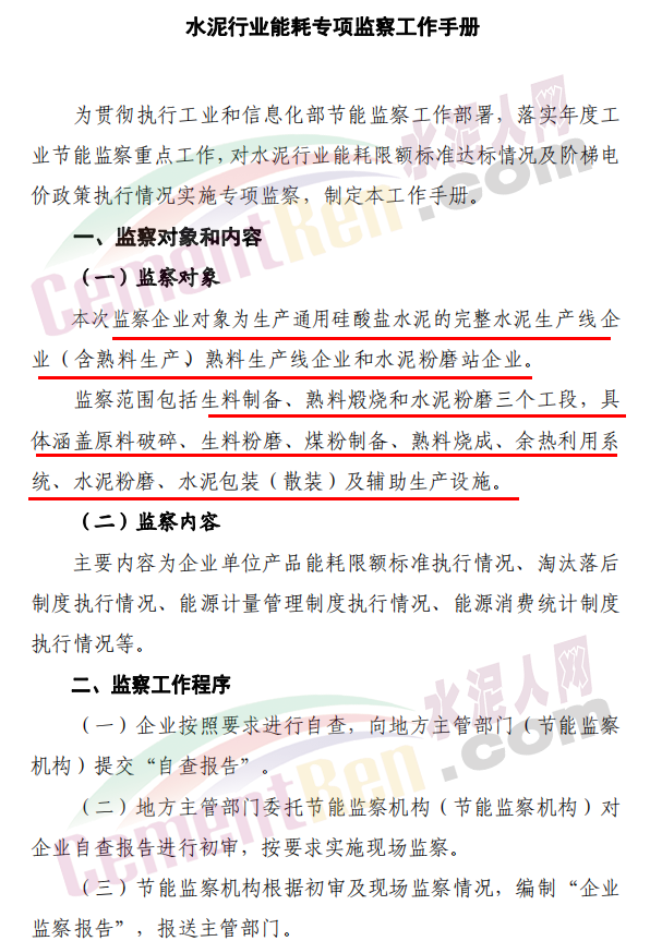 監察范圍包括生料制備、熟料煅燒和水泥粉磨三個工段,具體涵蓋原料破碎、生料粉磨、煤粉制備、熟料燒成、余熱利用系統、水泥粉磨、水泥包裝(散裝)及輔助生產設施。