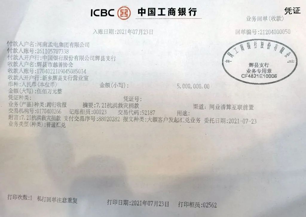 孟電集團捐款500萬元支援新鄉市防汛救災:7月23日,全國道德模范、中國好人、輝縣市孟莊鎮南李莊村黨支部書記、河南孟電集團黨委書記范海濤同志代表集團第一時間向輝縣市慈善協會捐款500萬元,用于防汛搶險救災。