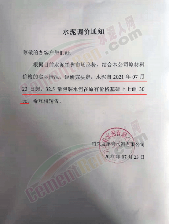 紹興山水回轉窯水泥粉磨有限公司通知,自7月23日起32.5水泥全品種規格出廠價在原基礎上上調30元/噸。