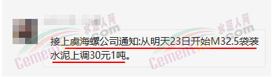 同期上虞區積山水泥、海螺水泥等通知從23日起上調32.5水泥價格30元/噸。