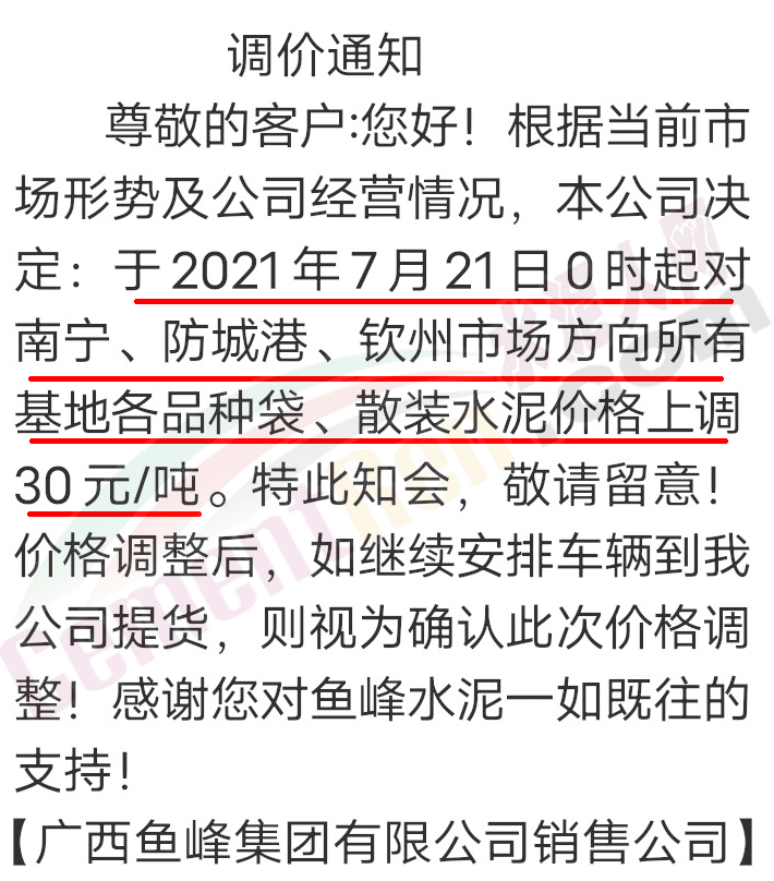 廣西魚峰集團有限公司銷售公司通知7月21日0時起對南寧、防城港、欽州市場方向所有基地各品種袋、散裝水泥價格上調30元/噸。