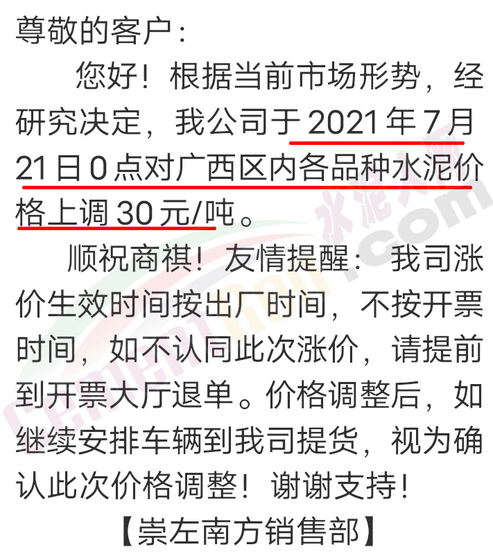 崇左南方銷售部通知于2021年7月21日0點對廣西區內各品種水泥價格上調30元/噸。如不認同此次漲價,請提前到開票大廳退單。價格調整后,如繼續安排車輛提貨,視為確認此次價格調整。
