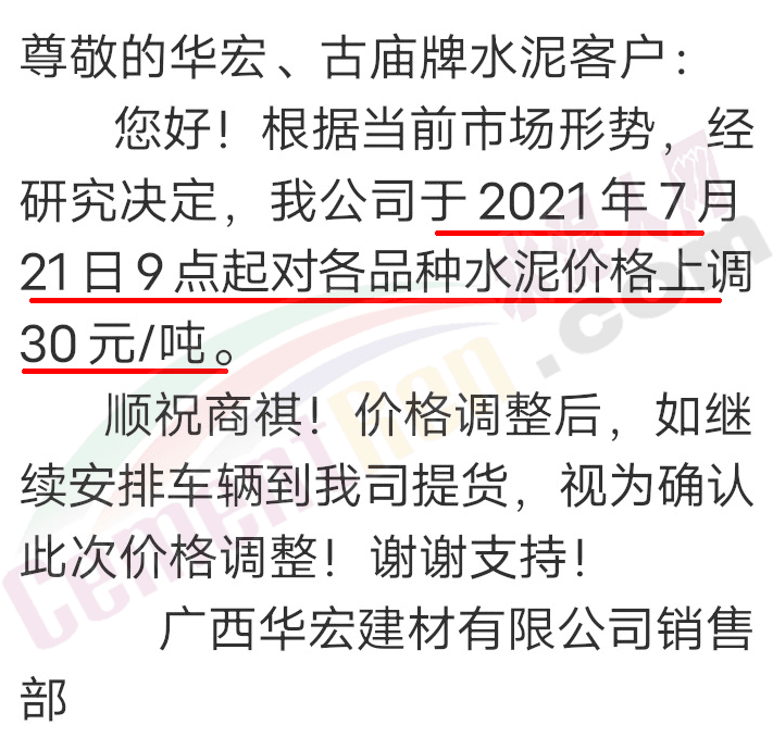 廣西華宏建材有限公司銷售部通知于2021年7月21日9點起對各品種水泥價格上調30元/噸。