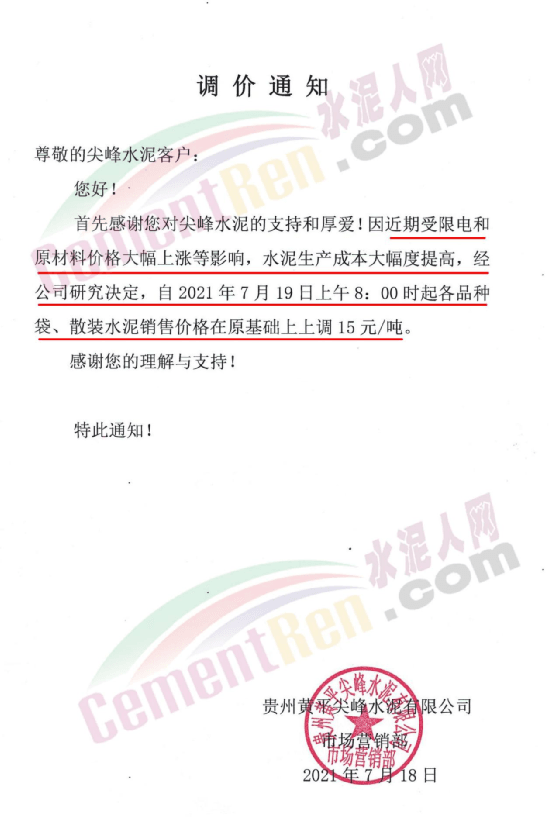 19日前后,貴州區域個別企業通知上調水泥價格15-20元/噸。其中貴州黃平尖峰水泥發調價通知稱,因近期受限電和原材料價格大幅上漲等影響,水泥生產成本大幅度提高,經公司研究決定上調各品牌袋、散裝水泥價格15元/噸。