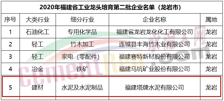日前,福建省工信廳發(fā)布了《關(guān)于發(fā)布福建省工業(yè)龍頭企業(yè)名單(第二批)的通知》,《通知》稱,武平縣的福建塔牌水泥有限公司被認定為2021年福建省工業(yè)龍頭培育企業(yè),為龍巖市5家企業(yè)之一。具體《通知》如下: