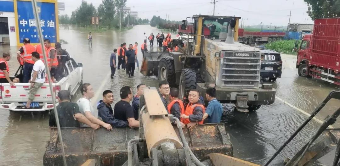 企業組織十余輛鏟車在政府及交通局的統一指揮下往輝縣市災區運送礦泉水方便面等物資,幫助災民度過難關!23日上午大部分村莊及家戶進水半米多深,一半村莊一米深的水,個別地方水深達1點5米,斷電斷水斷網絡,普通車輛無法運達,只有鏟車運人運物質。