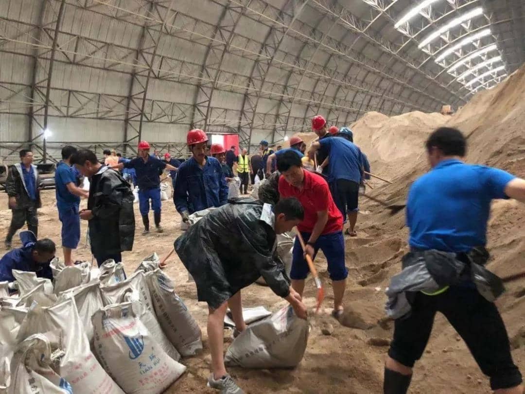 防汛搶險突擊隊在原料大棚灌裝沙袋