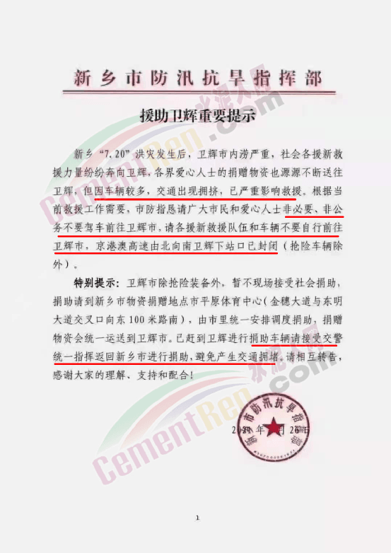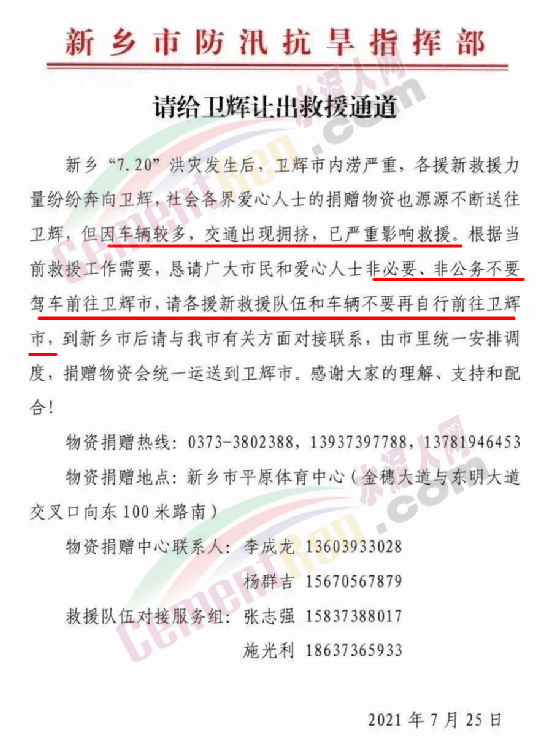 新鄉(xiāng)市防汛抗旱指揮部發(fā)出的《請給衛(wèi)輝讓出救援通道》中提到新鄉(xiāng)"7.20"洪災(zāi)發(fā)生后,衛(wèi)輝市內(nèi)澇嚴(yán)重,各援新救援力量紛紛奔向衛(wèi)輝,社會各界愛心人士的捐贈物資也源源不斷送往衛(wèi)輝,但因車輛較多,交通出現(xiàn)擁擠,已嚴(yán)重影響救援。根據(jù)當(dāng)前救援工作需要,懇請廣大市民和愛心人士非必要、非公務(wù)不要駕車前往衛(wèi)輝市,請各援新救援隊伍和車輛不要再自行前往衛(wèi)輝市,到新鄉(xiāng)市后請與有關(guān)方面對接聯(lián)系,由市里統(tǒng)一安排調(diào)度,捐贈物資會統(tǒng)一運(yùn)送到衛(wèi)輝市。