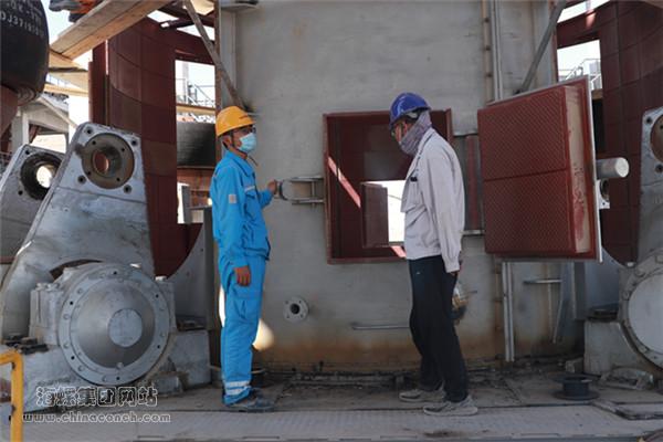錢宣紅(左一)與監(jiān)理檢查原料磨安裝質量