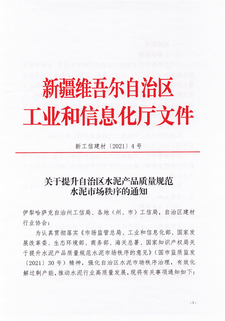 日前,新疆工信廳發布《關于提升自治區水泥產品質量規范水泥市場秩序的通知》要求各地工信部門要對歷年產能置換生產線進行排查治理,督促置換產能在建設項目投產前關停并完成拆除退出;所有熟料生產企業嚴格按照《關于進一步做好水泥常態化錯峰生產的通知》(新工信建材(2021)1號)要求執行錯峰生產計劃,通過合理縮短水泥熟料裝置運轉時間,有效壓減過剩產能,減輕大氣污染。