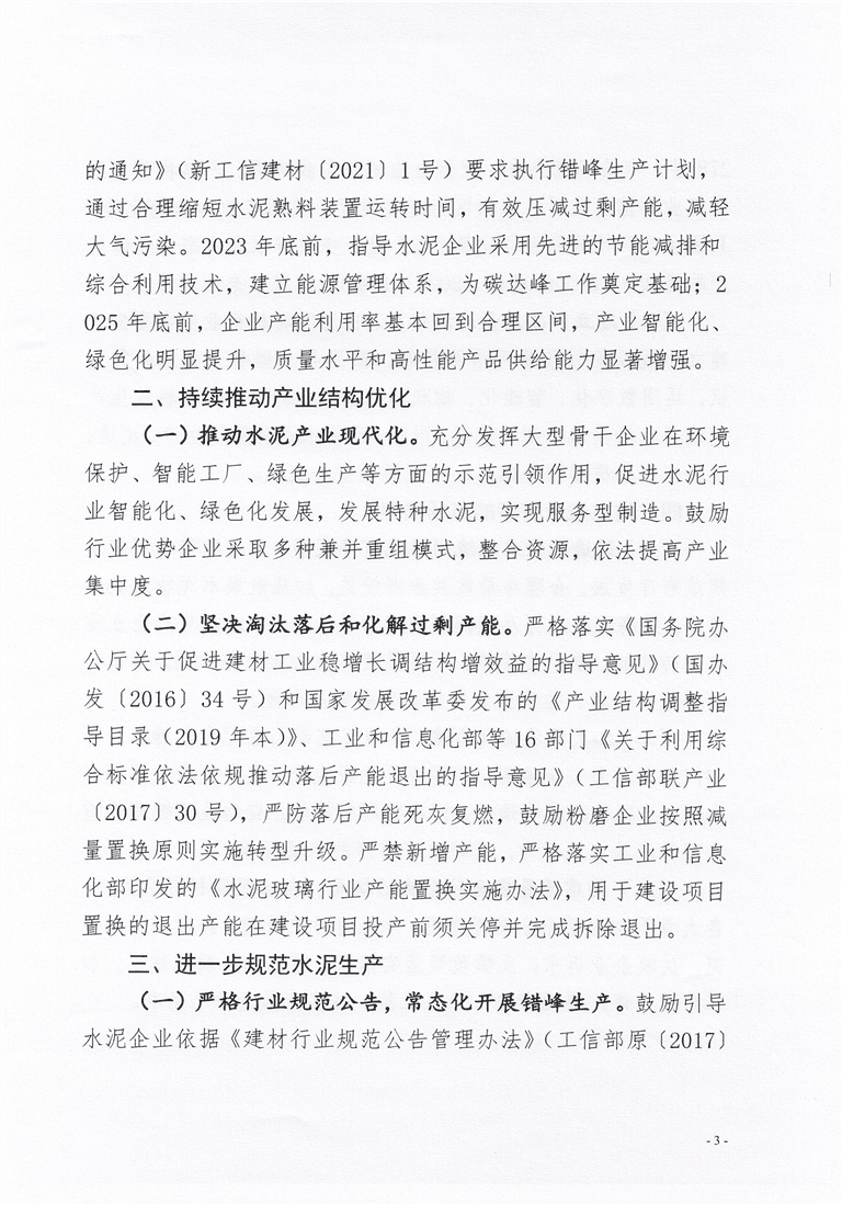 (一)嚴格行業規范公告,常態化開展錯峰生產。鼓勵引導水泥企業依據《建材行業規范公告管理辦法》(工信部原(2017)278號)申請規范公告,試行企業誠信自我聲明。嚴格執行自治區工業和信息化廳、自治區生態環境廳、兵團工業和信息化局、兵團生態環境局聯合印發的《關于進一步做好水泥常態化錯峰生產的通知》(新工信建材(2021)1號),推進常態化錯峰生產。