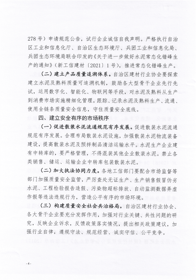 (三)構建質量安全社會共治格局。自治區建材行業協會、各大骨干企業要充分發揮作用,加強對行業關鍵、共性問題的研究,反映企業訴求,反饋政策落實情況,提出相關政策建議,加強行業自律,遵規守法、規范經營、誠實守信、公平競爭。