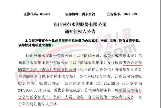 7月30日,冀東水泥上市公司發布《通知債權人公告》稱,唐山冀東水泥股份有限公司(以下簡稱公司、本公司或冀東水泥)擬向北京金隅集團股份有限公司(以下簡稱金隅集團)發行股份吸收合并金隅冀東水泥(唐山)有限責任公司(以下簡稱合資公司)并募集配套資金暨關聯交易(以下簡稱本次交易),公司為吸收合并方,合資公司為被吸收合并方,吸收合并后,公司注冊資本由134,752.2914萬元變更為247,963.6854萬元;吸收合并完成后,公司為存續主體,將承繼及承接合資公司的全部資產、負債、人員、業務、合同及其他一切權利與義務,合資公司將注銷法人資格。