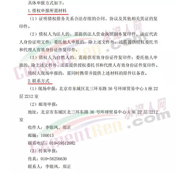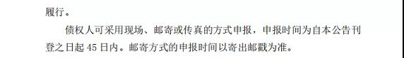 債權人可采用現場、郵寄或傳真的方式申報,申報時間為自本公告刊登之日起45日內。郵寄方式的申報時間以寄出郵戳為準。