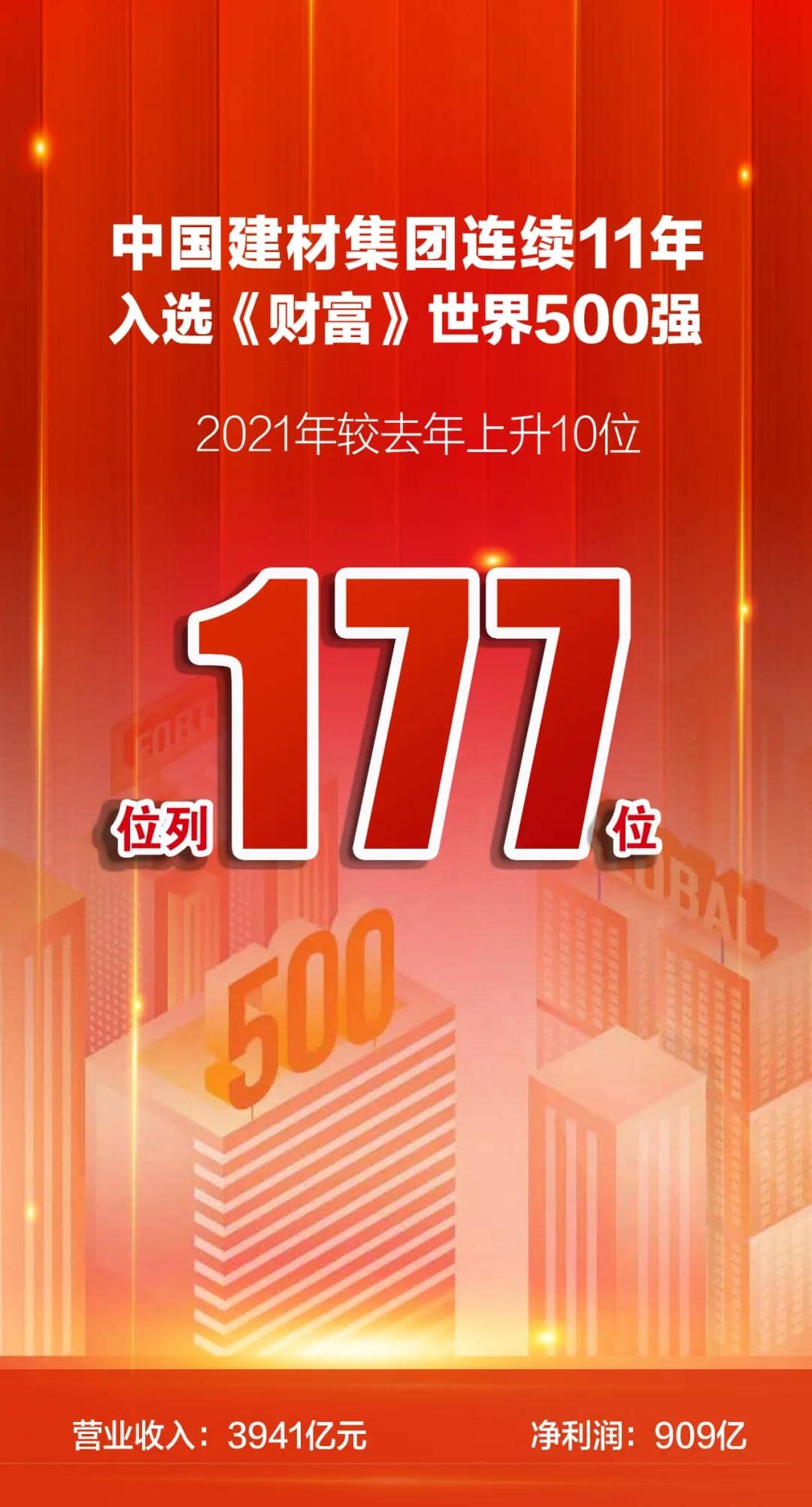 8月2日,2021年《財富》世界500強排行榜發(fā)布,中國建材集團以571.15億美元連續(xù)第11年入圍該榜單,位列177位,比上一年度前進10位,繼續(xù)穩(wěn)坐全球建材行業(yè)榜首位置。同時上榜的建材企業(yè)還有法國圣戈班集團266位,安徽海螺集團315位,愛爾蘭CRH441位。