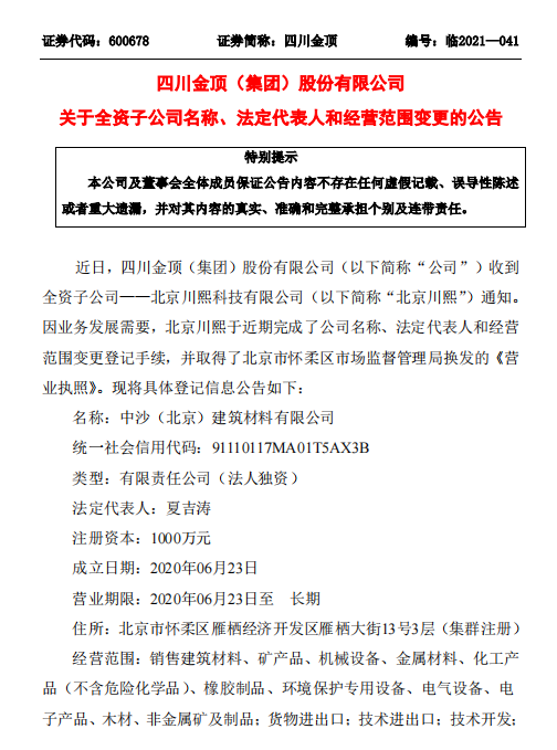 8月2日晚間公告:四川金頂(集團)股份有限公司(以下簡稱“公司”)收到全資子公司——北京川熙科技有限公司(以下簡稱“北京川熙”)通知。因業務發展需要,北京川熙于近期完成了公司名稱、法定代表人和經營范圍變更登記手續,并取得了北京市懷柔區市場監督管理局換發的《營業執照》。并將具體登記信息公告如下: