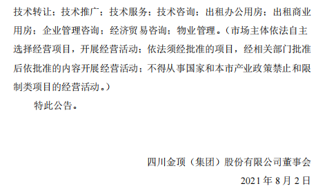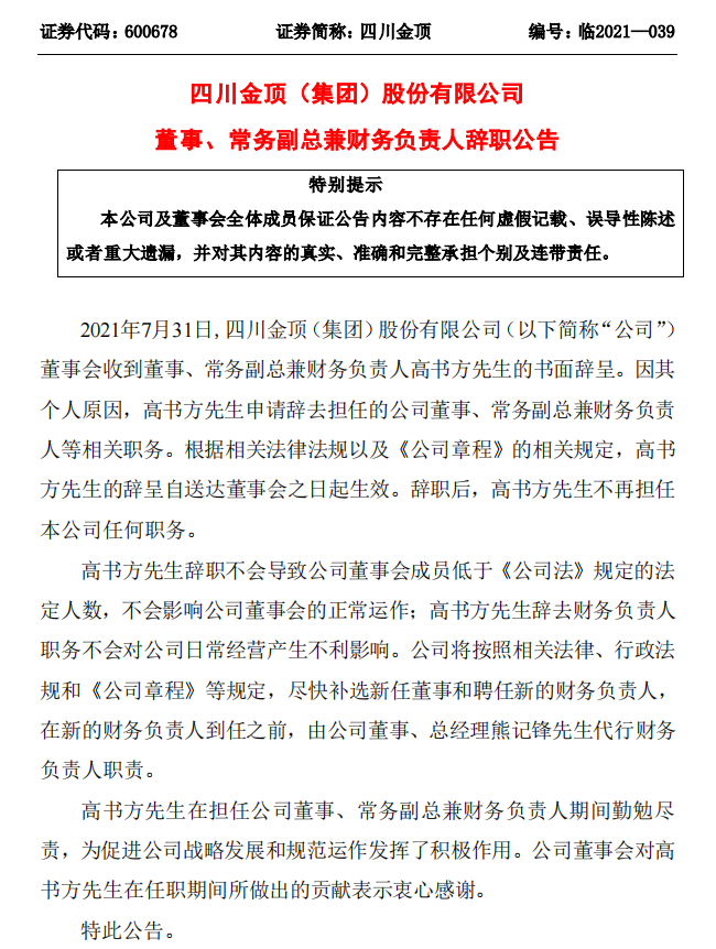 四川金頂公告,2021年7月31日,公司董事會收到董事、常務副總兼財務負責人高書方先生的書面辭呈。因其個人原因,高書方先生申請辭去擔任的公司董事、常務副總兼財務負責人等相關職務。根據相關法律法規以及《公司章程》的相關規定,高書方先生的辭呈自送達董事會之日起生效。辭職后,高書方先生不再擔任公司任何職務。