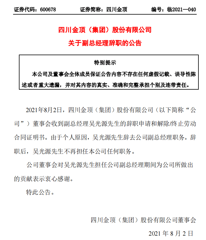 同期,四川金頂連續發布兩則高管辭職公告。2021年8月2日,四川金頂(集團)股份有限公司董事會收到副總經理吳光源先生的辭職申請和解除/終止勞動合同證明書。由于個人原因,吳光源先生辭去公司副總經理職務。吳光源先生不再擔任公司任何職務。