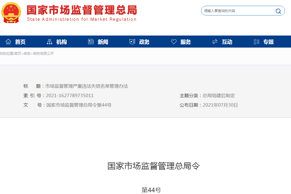 8月2日,國家市場監督管理總局發布了第44號總局令稱,《市場監督管理嚴重違法失信名單管理辦法》已經2021年7月22日市場監管總局第11次局務會議審議通過,現予公布,自2021年9月1日起施行。