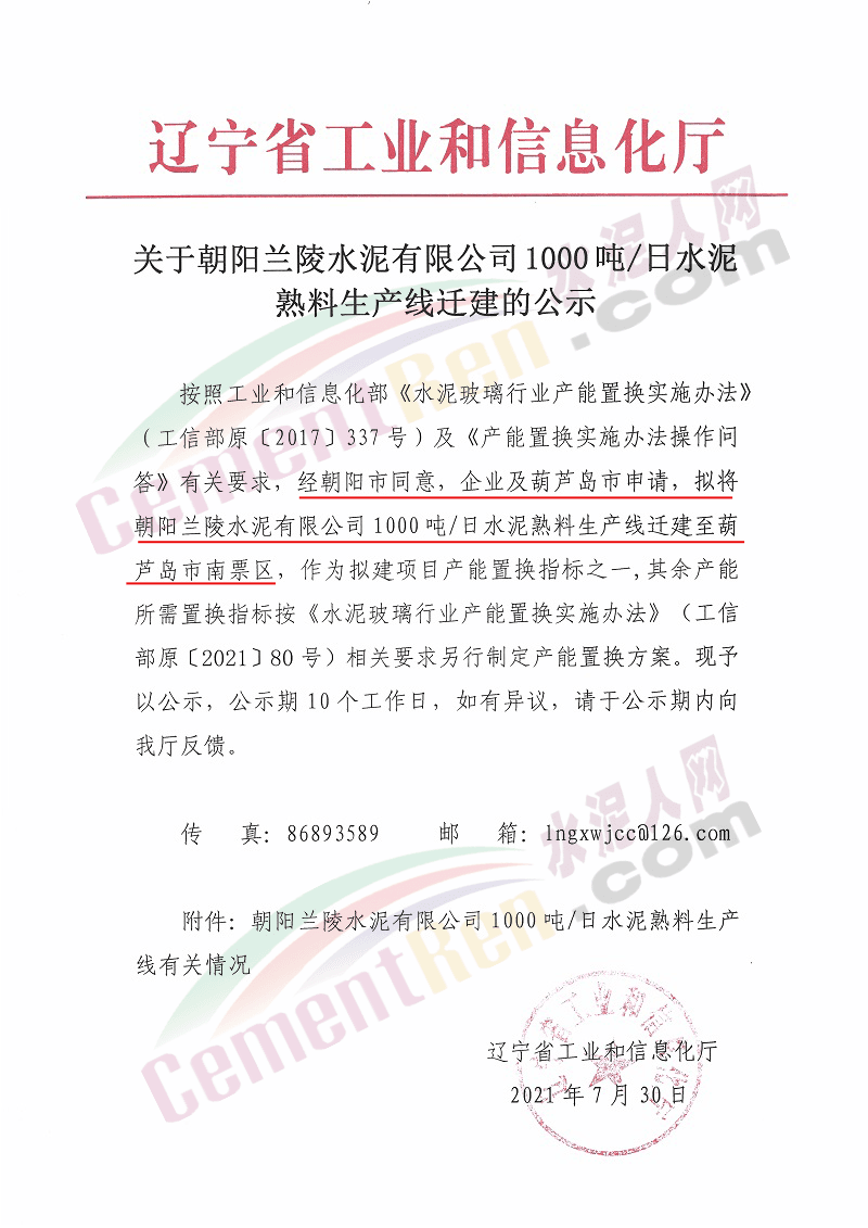 7月30日,遼寧省工信廳發布關于朝陽蘭陵水泥有限公司1000噸/日水泥熟料生產線遷建的公示。方案經朝陽市同意、企業和葫蘆島市申請,擬將朝陽蘭陵水泥有限公司1000噸/日水泥熟料生產線遷建至葫蘆島市南票區,原址生產線計劃在2023年10月25日關停,公示如下: