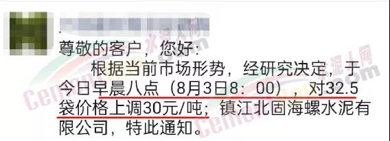 鎮江北固海螺水泥通知于8月3日早8點起32.5袋價格上調30元/噸。