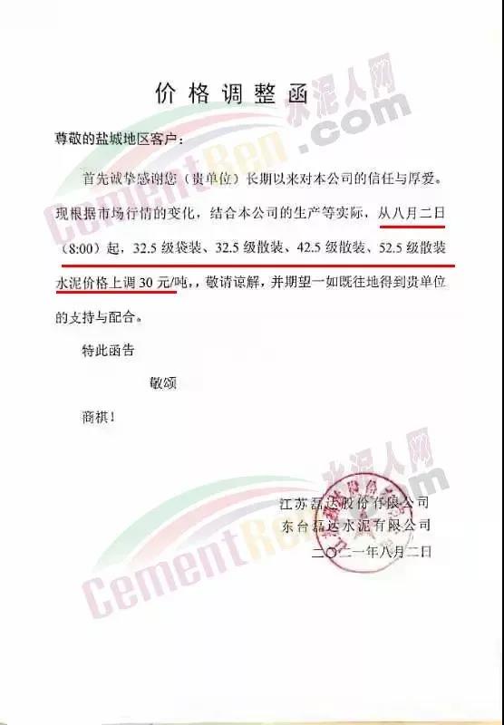 江蘇磊達水泥通知鹽城地區客戶,從8月2日8時起,32.5級、42.5級水泥價格上調30元/噸。