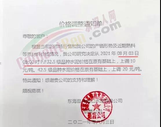 連云港東海縣馬陵山水泥有限公司通知根據當前的市場行情及公司的產銷形勢和近期熟料等原材料的價格情況,從8月3日8時起對P.F32.5級品種水泥價格上調10元/噸,42.5級品種水尼價格上調20元/噸。
