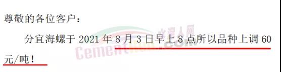 江西分宜海螺通知自8月3日早8點起水泥價格上調60元/噸。