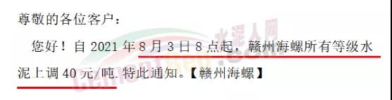 贛州海螺通知,自8月3日8點起所有等級水泥上調40元/噸。