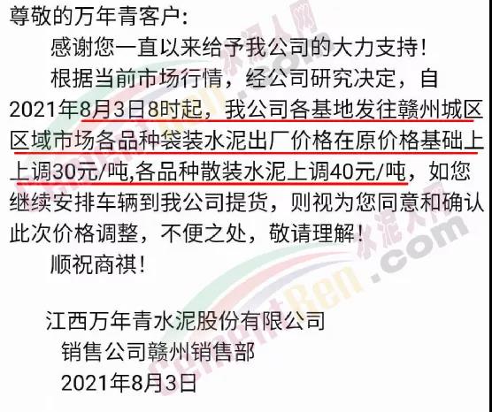 江西萬年青水泥股份有限公司贛州銷售部通知,自8月3日8時起,公司各基地發往贛州城區區域市場各品種袋裝水泥出廠價格在原價格基礎上上調30元/噸,各品種散裝水泥上調40元/噸。