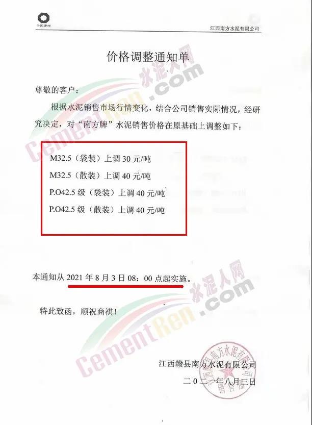 江西萬年青水泥股份有限公司贛州銷售部通知,根據當前市場行情,經公司研究決定,自8月3日8時起,公司各基地發往南康區域市場各品種袋裝水泥出廠價格在原價格基礎上上調30元/噸,各品種散裝水泥上調40元/噸。