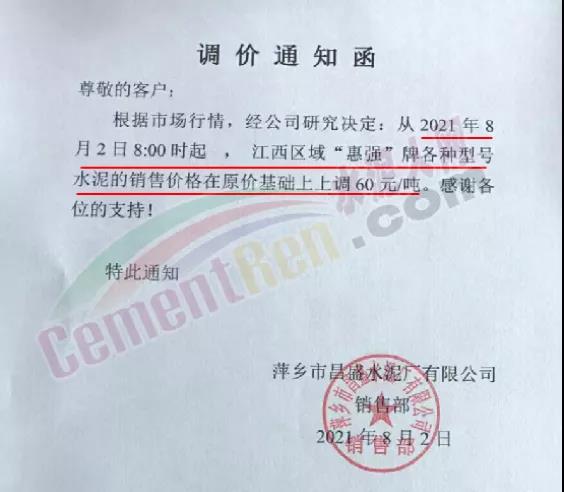 江西萍鄉市昌盛水泥廠有限公司通知,從8月2日8時起,江西區域“惠強”牌各標號水泥在原價基礎上上調60元/噸。