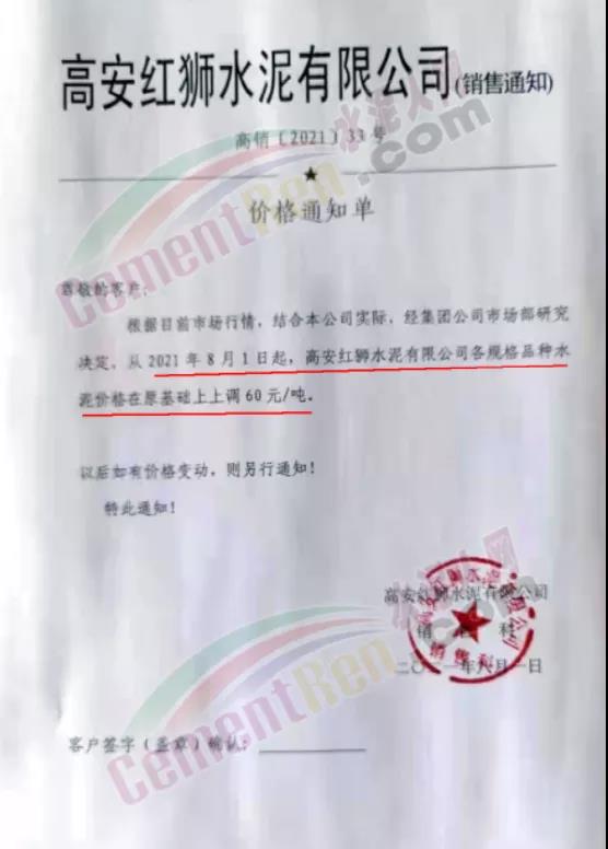 高安紅獅水泥通知根據目前市場行情,結合公司實際,經集團公司市場部研究決定,自8月1日起,高安紅獅水泥有限公司各規格品種水泥價格在原基礎上上調60元/噸。