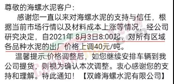 湖南省婁底市雙峰海螺水泥通知,根據當前市場行情以及材料成本上漲等情況,經公司研究決定,自8月3日8時起,對所有區域各品種水泥的出廠價格上調40元/噸。