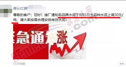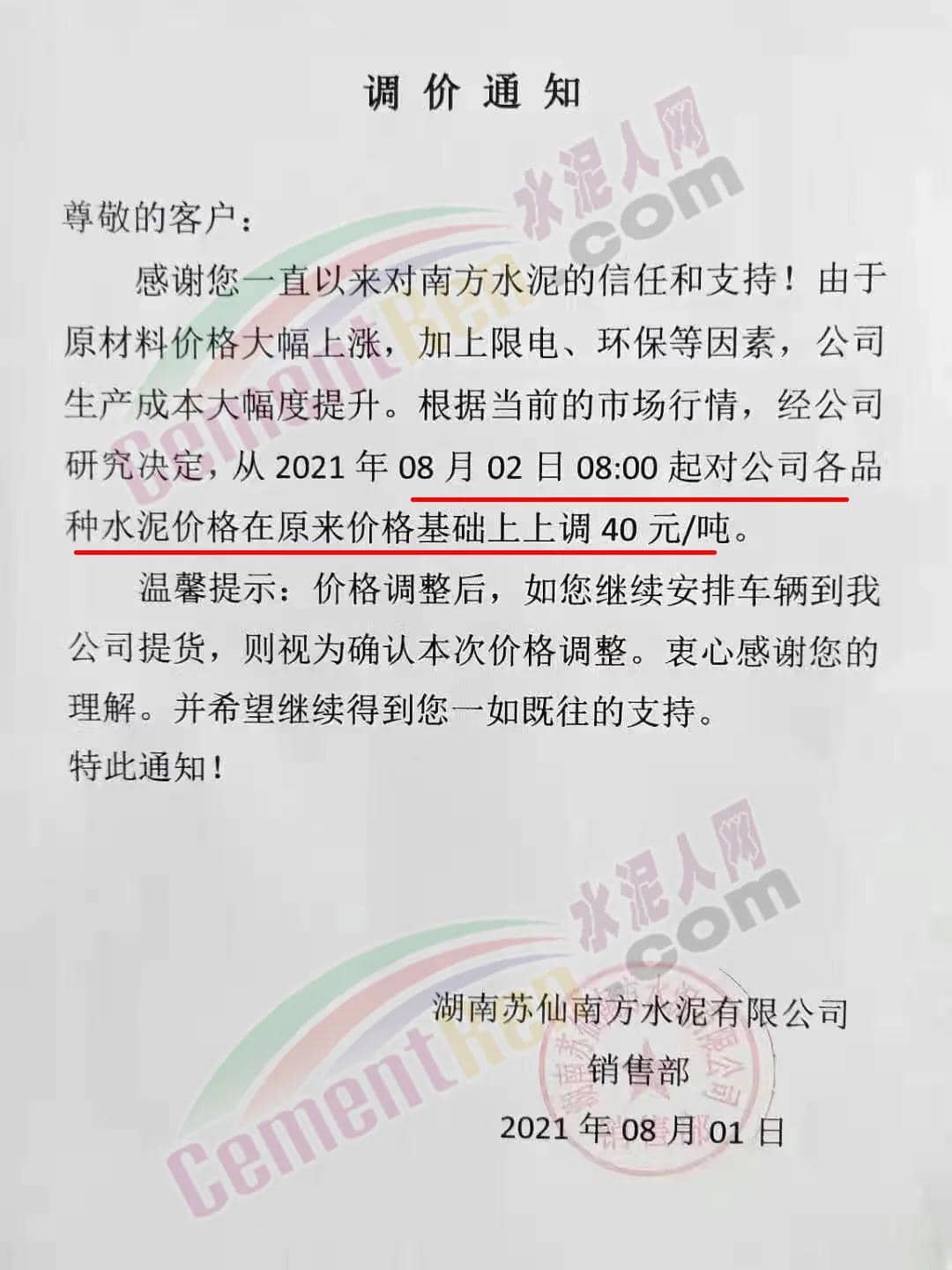 康達湖南水泥有限公司銷售科發調價通知單稱:根據市場情況,經研究決定從8月4日上午7時起,康達(湖南)水泥有限公司對湖南省內所有規格品種水泥合同價上調40元/噸。