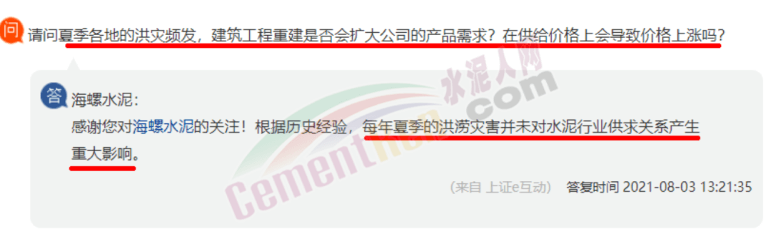 海螺水泥上市公司回復稱,根據歷史經驗,每年夏季的洪澇災害并未對水泥行業供求關系產生重大影響。