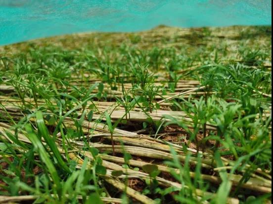 該項目所處地區為中原地區,氣候干旱少雨,礦山附近水源較少,為了保證種植的樹木花草能夠成活,在進行噴播綠化過程中,精心調配噴播土的成分組成,灌木、喬木、冷暖花草的選擇和搭配,在噴播完成后,及時進行草氈、麥秸、無紡布的覆蓋保濕,有效的保證了出芽率和成活率。