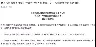 河南登封:全市居民小區(村)實行閉環管理;養老院、福利院、監所等機構暫停探視活動;公共浴室、美容美發、娛樂場所、線下培訓、托幼機構等密閉場所暫停開放;公墓、骨灰堂(塔陵)暫停祭掃;宗教活動場所暫時關閉;餐飲場所嚴禁堂食;嚴禁各類集聚性活動,不聚集、不扎堆;非生活必需場所一律暫時停業。