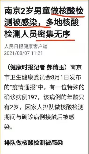 多地群眾反應,檢測現場亂糟糟的一堆人擁擠推搡,進展緩慢且隊伍越來越長,部分熟人一同排隊不戴口罩還唾沫橫飛的聊天,哪顧得什么“一米線”的限制。南京某2歲男童隨家人排隊做核酸檢測,期間家人與鄰居有近距離交談(接觸確診病例),后隨家人與另一鄰居在家后院交談(接觸確診病例),此后被診斷為新冠肺炎確診病例,讓人倒吸一口涼氣。
