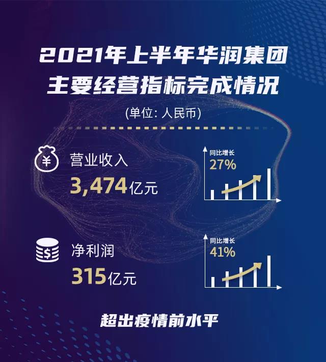 2021年上半年,華潤集團業績增長良好,營收、凈利潤分別為3,474億元及315億元,實現同比增長27%及41%,超出疫情前水平。