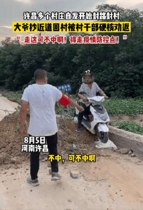 圖:8月5日,河南許昌,為了疫情防控村莊自發封路封村,大爺抄近道回村被村干部硬核勸返:“不中,那可不中!走疫情防控點!”